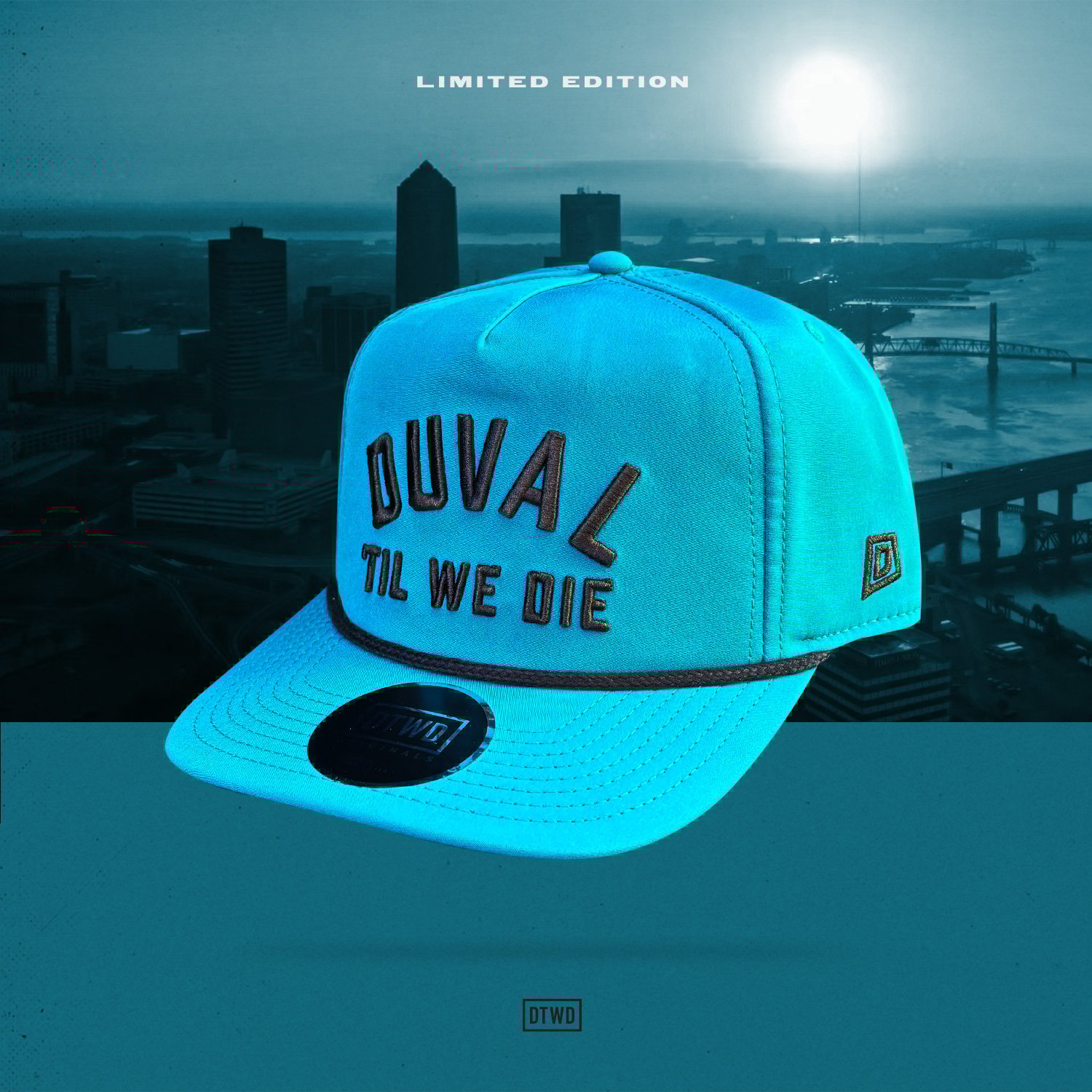 This is a relaxed fabric poly-blend, teal fabric with black rope and adjustable snapback.
